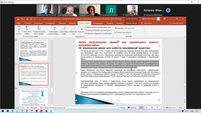 Адже, наслідки військового вторгнення росії на територію України охопили усі сфери та суттєво вплинули на бізнес-середовище і, зокрема, аудиторську діяльність, функціонування якої розділилося на до та після 24 лютого. М. Романюк відмітив, що в перші дні війни Аудиторська Палата України виступила зі зверненням до аудиторсько-бухгалтерської спільноти світу із закликом зупинити війну, отримавши підтримку від Польської палати обов’язкових аудиторів, Палати фінансових аудиторів Румунії, аудиторів Чехії, Болгарії, Словенії, Німеччини, інших країн Європи та світу, авторитетних міжнародних організацій та спілок, професійних бухгалтерів та аудиторів. Радою Аудиторської палати України опубліковано інформаційні повідомлення та листи «Щодо впливу військової агресії російської федерації на окремі аспекти діяльності суб’єктів аудиторської діяльності»; «Щодо впливу військової агресії російської федерації на фінансову звітність та аудиторські звіти»; «Розгляд аудитором безперервності діяльності під час аудиту фінансової звітності», зміст яких було обговорено під час проведення онлайн-лекції. М. Романюк проінформував, що внаслідок війни змінилися регуляторні правила для українського аудиту, підходи до виконання аудиторами своїх професійних обов’язків.