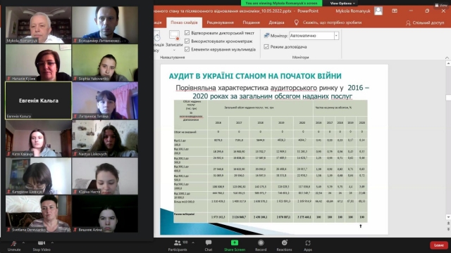 «Ніколи, ніколи, ніколи, ніколи не здавайтесь» – саме таким афоризмом Вінстона Черчілля розпочалась гостьова лекція на тему «Аудиторська діяльність в умовах воєнного стану та післявоєнного відновлення економіки» для здобувачів першого (бакалаврського) та другого (магістерського) рівнів вищої освіти освітньо-професійної програми «Облік і аудит» та здобувачів третього (освітньо-наукового) рівня вищої освіти, що навчаються за освітньо-науковою програмою «Облік і оподаткування» зі спеціальності 071 «Облік і оподаткування». Близько 100 учасників в онлайн-аудиторії із неприхованою цікавістю слухали лектора – Миколу Васильовича Романюка – кандидата економічних наук, доцента кафедри фінансів економічного факультету Київського національного університету імені Тараса Шевченка; аудитора, директора ТОВ «Нексія ДК Аудит і Податки»; партнера з контролю якості Групи компаній «Nexia DK. Auditors & Consultants»; члена Ради Аудиторської палати України (АПУ).