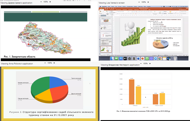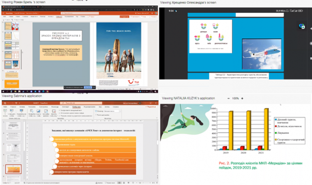 Карина Жук, розпочала свою доповідь словами української письменниці та поетеси Ліни Костенко: Буває, часом сліпну від краси. Спинюсь, не тямлю, що воно за диво,– оці степи, це небо, ці ліси, усе так гарно, чисто, незрадливо, усе як є – дорога, явори, усе моє, все зветься – Україна. Така краса, висока і нетлінна, що хоч спинись і з Богом говори. Ці слова Ліни Костенко дуже влучно характеризують нашу Україну, в якій є величезний потенціал для розробки національних туристичних продуктів. Студенти представили свої доповіді і презентаційні роботи, що охоплювали широке коло актуальних питань з туристичної галузі, та є підсумовуванням набутих навичок, знань та умінь. Крім того, студенти могли проявити свою майстерність подавати матеріал наочно. У своїх бакалаврських кваліфікаційних роботах здобувачі вищої освіти показали вміння аналізувати досліджувану проблему, логічно та грамотно викладати свої думки у науковому стилі, обирати та застосовувати різноманітний інструментарій дослідження, дотримуватись академічної доброчесності. Кваліфікаційні роботи насичені графічним матеріалом, який дозволяє краще сприйняти і зрозуміти тему проведеного дослідження.