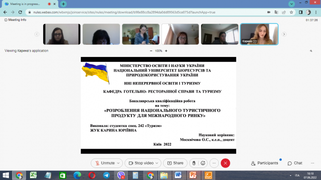 З 6 червня 2022 р. по 9 червня 2022 р. на кафедрі готельно-ресторанної справи та туризму ННІ неперервної освіти і туризму працювала екзаменаційна комісія по захисту бакалаврських кваліфікаційних робіт студентів спеціальності 242 «Туризм». Відповідно до Наказів Національного університету біоресурсів і природокористування України від 10 травня 2022 р. №173 «З» та №174 «Д» була створена екзаменаційна комісія для проведення атестації випускників освітньо-професійної програми підготовки фахівців освітнього ступеня «Бакалавр» спеціальності 242 «Туризм» заочної і денної форм навчання на підставі рішення вченої ради НУБІП України від 28.12.2021 р. (протокол №5) щодо затвердження голів екзаменаційних комісій НУБіП України на 2022 р. Екзаменаційна комісія працювала у складі: Байдала В.В., завідувач кафедри економіки, д.е.н., професор – голова комісії; Члени комісії: Левицька І.В., завідувач кафедри готельно-ресторанної справи та туризму, д.е.н., професор; Москвічова О.С., доцент кафедри готельно-ресторанної справи та туризму, к.е.н., доцент; Кудінова І.П., доцент кафедри готельно-ресторанної справи та туризму, к.е.н., доцент; Микицей Т.Д., заступник директора з навчальної а виховної роботи ННІ неперервної освіти і туризму, к.е.н., доцент; Кузик Н.П., доцент кафедри обліку та оподаткування, к.е.н. – секретар комісії.
