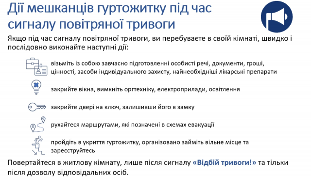 Анатолій Дмитрович, розпочавши свою промову, нагадав мешканцям про алгоритм поводження під час повітряних тривог, та необхідність його дотримання. Декан наголосив, що укриття яке знаходиться в підвальному приміщенні гуртожитку облаштоване згідно всіх вимог та стандартів, в укритті знаходиться достатня кількість питної води, аптечки та інші життєво необхідні речі, після чого Анатолій Дмитрович, розповів про порядок дій старост блоків, які під час повітряної тривоги, як відповідальні особи повинні проінформувати всіх мешканців блоку, про необхідність спуститись в укриття, взявши з собою речі першої необхідності, і в разі, якщо деякі студенти відмовляться або проігнорують, то записати кількість осіб, які залишились на блоці. Олена Григорівна наголосила на загальних правилах поведінки в умовах воєнного стану та дій під час комендантської години, оскільки їх дотримання є ключовим елементом безпеки в умовах сьогодення. У своєму звернені декан наголосила на важливості дотримання даних правил кожним студентом та його відповідальності за власне життя.