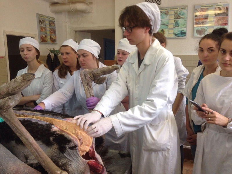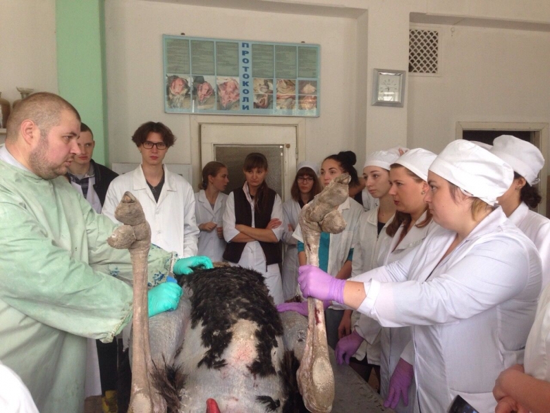 Майбутнім фахівцями запропонували взяти участь в одному з чисельних розтинів, які проводять співробітники кафедри. У цей день до клінічного центру «Ветмедсервіс» на розтин поступили чотири африканські страуси, які загинули від невідомих причин.