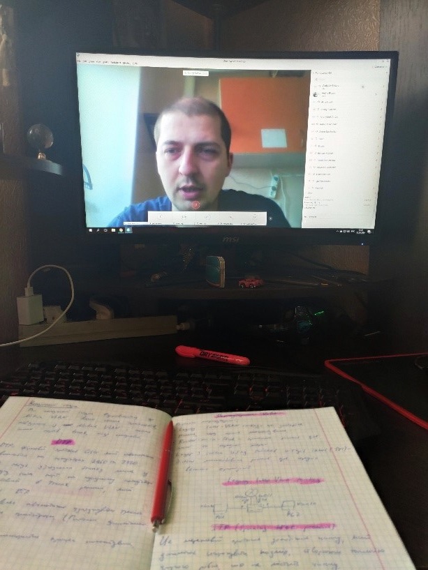 Студенти можуть бачити та чути викладача (на фото доцент Максим Місюра читає лекцію з Комп'ютерних систем), екран його комп’ютера, на якому відтворюється необхідна інформація. Окрім цього, функціонує ресурс E-Learn, на якому містяться всі необхідні документи, інструкції до лабораторних робіт, конспекти лекцій та презентації до них, а також додаткові відео-уроки та посилання на корисні ресурси. Сюди ж і слід завантажувати виконані роботи на перевірку. Однак, все це не може в повній мірі замінити живе навчання в стінах університету. Дані сервіси та ресурси є чудовим рішенням на випадок надзвичайних ситуацій, таких як карантин, однак, не в змозі замінити живе спілкування з одногрупниками, викладачами, роботу на реальному обладнанні. Тож, поки працюємо в такому режимі. Однак, очікуємо можливості знову наживо зустрітися з викладачами та одногрупниками. Здоров’я всім!