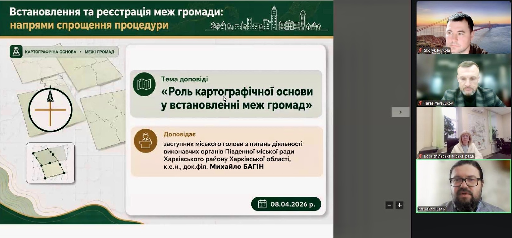 Заступник міського голови Південної міської ради Харківського району Харківської області Михайло БАГІН розповів про роль картографічної основи у встановленні меж громади. Експерт зазначив, що картографічна основа є основою для встановлення дійсної меж територіальної громади, забезпечуючи точне визначення просторового охоплення повноважень місцевого самоврядування. Використання сучасної цифрової картографічної основи дозволяє уникнути земельних спорів та навести лад у використанні земель Картографічна основа включає цифрові карти, кадастрові дані та координати поворотних точок, що дозволяють замінити умовні межі на точні юридичні кордони. Цифрова основа дозволяє громаді чітко бачити свої земельні ресурси, інфраструктурні об'єкти, дороги та вулиці. Також доповідач навів конкретні приклади щодо відмінності попередніх картографічних матеріалів реальній ситуації та приклади розміщення земельних ділянок у двох громадах. Підсумовуючи свій виступ він зазначив, що встановлення меж громади потребує якісних планово-картографічних матеріалів, наявні проекти формування не можуть бути єдиною основою ля розроблення землевпорядної документації по встановленню нової межі, потрібно виконувати геодезичні вимірювання щонайменше проблемних місць, уникати заниження реальної вартості проекту при підготовці тендерних пропозицій.