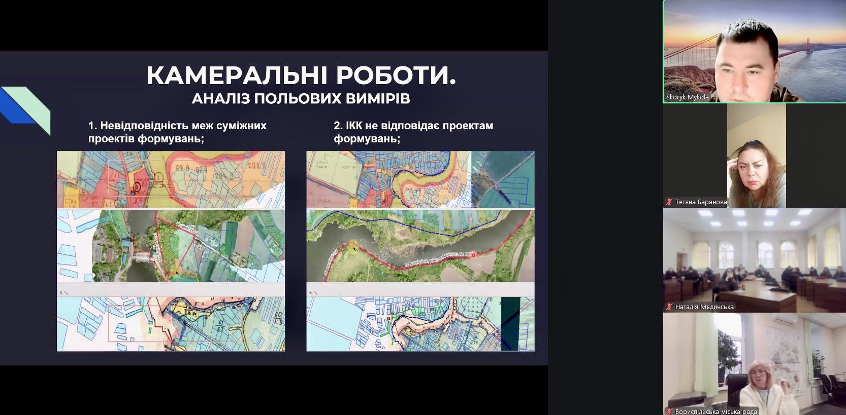 Далі доповідачі обговорили практичні кейси встановлення меж територіальних громад. Зокрема керівник відокремленого підрозділу Київської області ГО «АСГУ» Микола СКОРИК поділився досвідом розробки проєктів землеустрою щодо встановлення меж територіальних громад. Вони розробляються з метою з’ясування дійсної межі території територіальної громади, вирішення спору між декількома органами місцевого самоврядування щодо меж територій територіальних громад, внесення відомостей про межі території територіальної громади до Державного земельного кадастру.