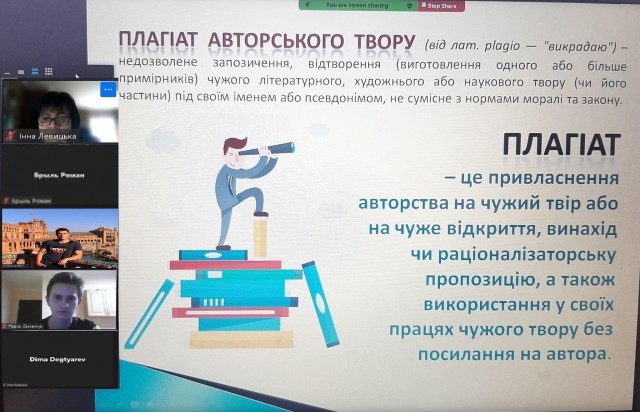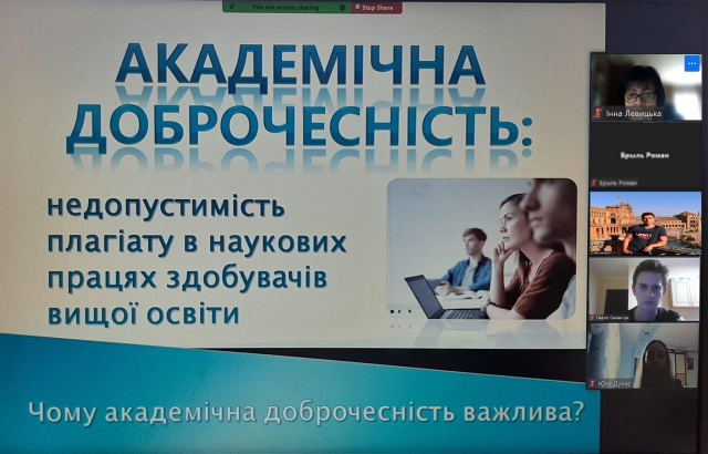 Під час зустрічі здобувачів вищої освіти ознайомлено із положенням про дотримання принципів академічної доброчесності в НУБіП України, розглянуто поняття та принципи академічної доброчесності, організацію роботи комісій з питань академічної доброчесності в Університеті, відповідальність за порушення принципів академічної доброчесності та запобігання проявам академічної недоброчесності.