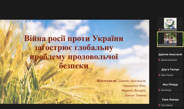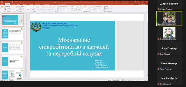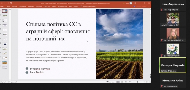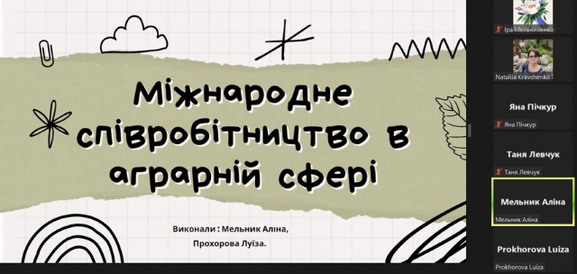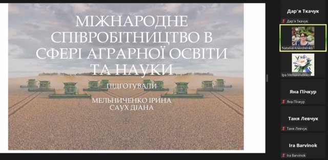04 листопада 2023 року зі студентами-магістрами 1 курсу заочної форми навчання спеціальності «Міжнародні відносини, суспільні комунікації та регіональні студії» на гуманітарно-педагогічного факультеті НУБіП України в рамках роботи студентського наукового гуртка «History of Ukraine. The History of Native Land. Family History» (науковий керівник – Кравченко Н.Б.) було організовано круглий стіл «Cooperation in the Agro-Industrial Complex: International Aspect». Мова спілкування – англійська, українська.