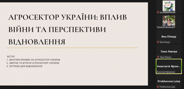 Загалом магістри дійшли висновку, що система агропромислового комплексу (АПК) є важливою складовою економіки багатьох країн і вимагає ефективного міжнародного співробітництва для забезпечення сталого розвитку, підвищення продуктивності та вирішення глобальних проблем. Міжнародне співробітництво в системі АПК важливе для вирішення глобальних викликів та забезпечення сталого розвитку агропромислового сектору. Зокрема, акцентувалась увага на: загостренні глобальної проблеми продовольчої безпеки в умовах російсько-української війни; збитках та втратах агросектору України в умовах воєнного стану, перспективах його відновлення.