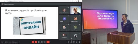 Своє бачення розвитку СО факультету представив кандидат на пост голови - студент 3 курсу спеціальності 121 «Інженерія ПЗ» Яковлєв Олексій. Студент підняв важливі соціальні питання, зокрема булінгу, наголосив на важливості заходів, які б сприяли комфортному навчанню, враховували як соціальну підтримку так і норми, які би обмежували прояви булінгу. Також Олексій звернув увагу на важливість організації заходів в підтримку випускників НУБіП України, які є учасниками бойових дій.