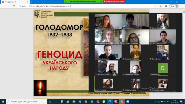 Староста групи Ярослава Іщенко продемонструвала презентацію і розповіла про наслідки голодомору та реакцію міжнародної спільноти на Голодомор. Історики та демографи ще й досі сперечаються щодо кількості жертв голодомору, називаючи різні дані – від 3 до 10 мільйонів. Найвірогідніше, враховуючи матеріали перепису населення 1937 р., втрати населення внаслідок повного фізичного виснаження, тифу, кишково-шлункових отруєнь, канібалізму, репресій, самогубств на ґрунті розладу психіки та соціального колапсу становили на теренах України близько 7 мільйонів осіб.