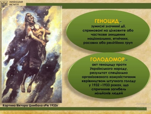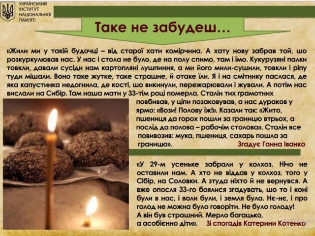 Голодомор 1932–33 років – це свідомо заподіяна акція. Як свідчать документальні джерела, хліб в Україні був, але хліб з України забрали. З України вивозили вже не тільки посівний матеріал, але й навіть квашені огірки, капусту та помідори, напевно залишаючи людей приреченими на голодну смерть.
