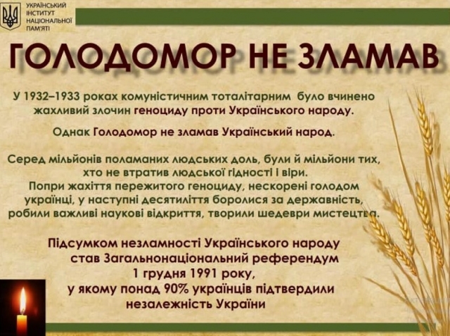 Всеукраїнська акція «Запали свічку». В Україні є давній звичай – у пам’ять про померлу людину запалюють свічку. І щороку в Україні у четверту суботу листопада на пам’ять про тих людей, які померли з голоду, запалюють свічки. Цього року 28 листопада 2020 року, о 16 годині Україна схилить голови у загальнонаціональній хвилині мовчання на знак вшанування всіх убитих голодом.