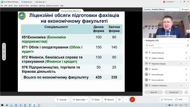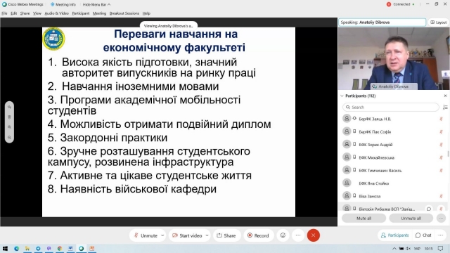 Модератор заходу – доцент кафедри обліку та оподаткування Володимир Литвиненко – озвучив питання форуму зустрічі щодо навчання в англомовних групах, на військовій кафедрі, можливостей закордонного навчання за подвійними дипломами та практичного стажування на які учасники отримали вичерпні відповіді.