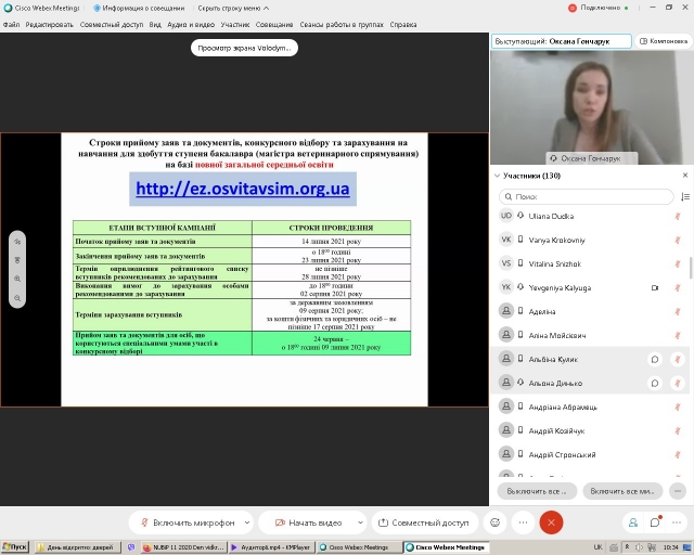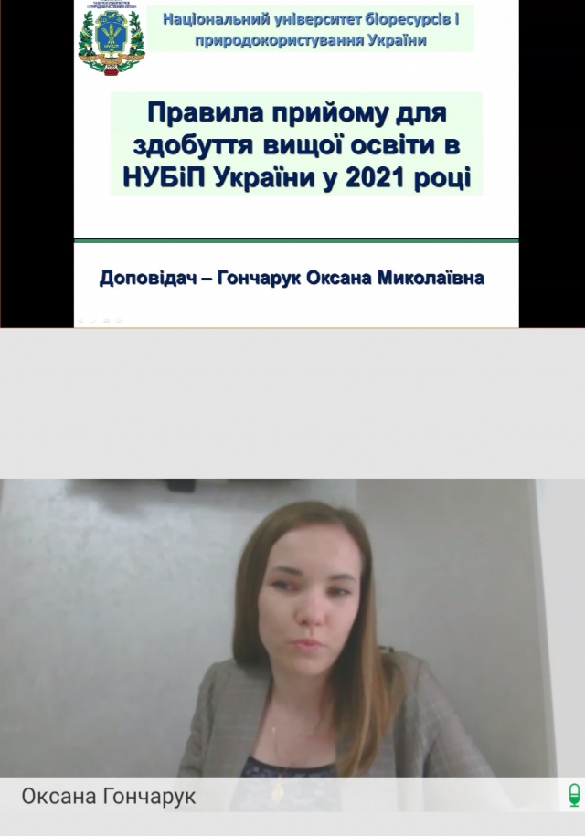 Вичерпну презентацію про особливості вступної кампанії 2021 р. підготувала заступник секретаря приймальної комісії Оксана Гончарук, надала відповіді на запитання щодо нюансів вступу на бюджет і на контрактну форму навчання; як здійснюється подання документів для вступу; як правильно розставити пріоритети, вартість навчання, пільги для багатодітних і для дітей-інвалідів; вимоги для вступу на заочну форму навчання та продемонструвала майбутнім вступникам як працювати зі сайтом університету.