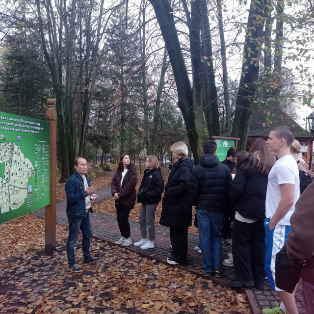 Щороку перед випускниками шкіл постає складний вибір щодо того, який ЗВО обрати. Мабуть, найкращий варіант зробити правильний крок – побачити майбутній заклад вищої освіти з середини і почути про нього відгуки студентів. Тому Національний університет біоресурсів і природокористування України регулярно відчиняє свої двері для потенційних вступників. День відкритих дверей у НУБіП України – це традиційний захід, долучившись до якого майбутні абітурієнти можуть отримати всю необхідну інформацію про ВНЗ, безпосередньо ознайомитися з організацією навчального процесу, побачити майбутніх викладачів і зробити такий необхідний у житті кожної людини вибір на шляху до здобуття вищої освіти. Ось і 9 листопада 2023 року в Національному університеті біоресурсів і природокористування України відбувся черговий День відкритих дверей для випускників шкіл, гімназій, ліцеїв України, батьків і всіх бажаючих. Економічний факультет загалом і кафедра економіки, зокрема, також долучилися до заходу й поділилися секретами навчання в університеті, на факультеті та спеціальності «Економіка». День відкритих дверей проходив у змішаному форматі. Чи не найпершими кафедра економіки зустрічала столичних гостей – учнів київської школи № 151 у супроводі заступника директора з виховної роботи Давидової Любов Андріївни та вчителя географії, класного керівника Прохорової Антоніни Володимирівни, які прибули на запрошення доцента кафедри Гуцул Тетяни Анатоліївни. Уже о 9-тій годині ранку розпочалася екскурсія до Ботанічного саду НУБіП України – перлини університету, Голосіївського району та Києва. Запрошений екскурсовод – фахівець розповів, що Ботанічний сад було засновано ще 1928 року, хоча далеко не всі кияни знають про його існування. Розташований неподалік від навчальних корпусів вишу на вулиці Героїв Оборони, нині він займає територію 53 гектари, є важливою навчально-науковою базою для дослідження, збереження, акліматизації та розмноження у спеціально створених умовах рідкісних і типових видів рослин, дерев місцевої і світової флори та є просто чудовим місцем для відпочинку й релаксації студентів, викладачів і гостей університету.