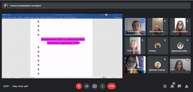 15 листопада 2021 року в рамках навчальної дисципліни «Лобізм у праві» студентам були запропоновані ситуації щодо проблем булінгу та «зелених технологій». В описовій частині мова йшла про ситуацію в досліджуваній галузі, про коло зацікавлених суб'єктів та основи правового регулювання. Завдання полягало в тому, щоб визначити об'єкт лобіювання та підібрати стратегію роботи з громадянським суспільством.