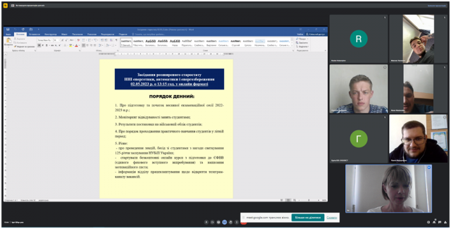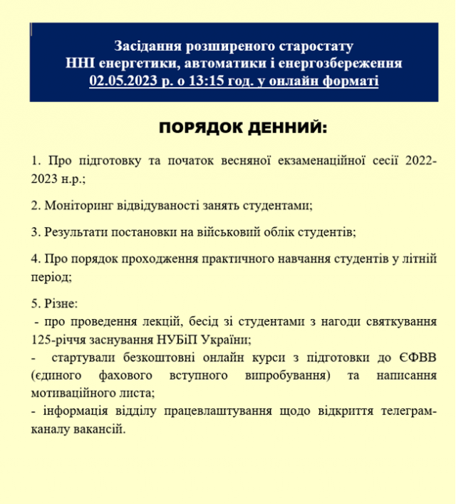 Цього разу порядок денний налічував низку питань повязаних із завершенням весняного семестру, складанням іспитів та проведенням практичного навчання студентів у літній період.