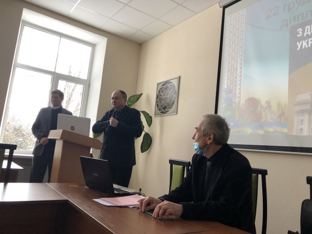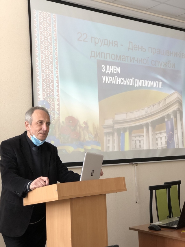 Далі взяв слово доктор політичних наук Гольцов А.Г. (кафедра філософії та міжнародної комунікації), який у своєму виступі розповів про надзвичайну важливість і актуальність спеціальності «Міжнародні відносини» для сьогодення. За цим послідував виступ викладача кафедри міжнародних відносин і суспільних наук, доцента Оснача О.М., присвячений тому великому шляху, який пройшла дипломатична служба України за час свого існування.