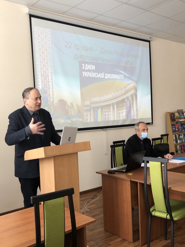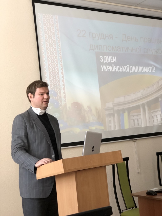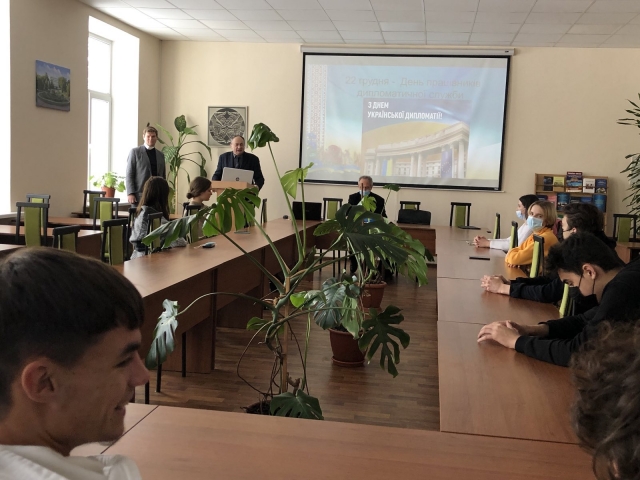 22 грудня в стінах нашого університету був проведений урочистий захід для студентів молодших курсів спеціальності «Міжнародні відносини, суспільні комунікації та регіональні студії», присвячений Дню працівників дипломатичної служби України. Організаторами заходу виступили деканат гуманітарно-педагогічного факультету, кафедра міжнародних відносин та суспільних наук і кафедра філософії та міжнародної комунікації.