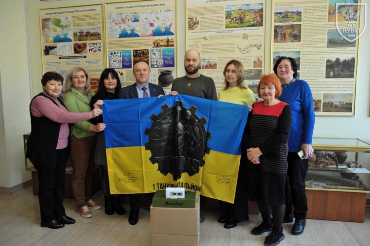 Валентин Білоус передав Подяку та прапор підрозділу від командування військової частини Первинній профспілковій організації НУБіП України із словами вдячності за надання важливої допомоги Збройним силам України, за активну громадську позицію, за внесок у спільну справу боротьби з ворогом.