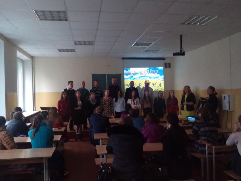 19 листопада у межах одного з магістерських досліджень, яке присвячене розробці методики реалізації національно-патріотичного виховання студентської молоді у вищих навчальних закладах, студенткою спеціальності «Педагогіка вищої школи» Мельнічук Юлією (науковий керівник – доцент Виговська С. В.) було організовано й проведено виховний захід «Моя країна – Україна» для студентів першого курсу гуманітарно-педагогічного факультету. Активну участь у ньому взяв народний ансамбль пісню і танцю «Колос» імені С. А. Семеновського (хорова група).