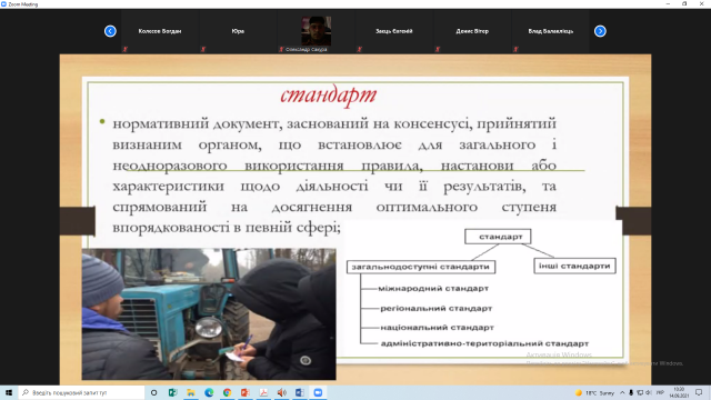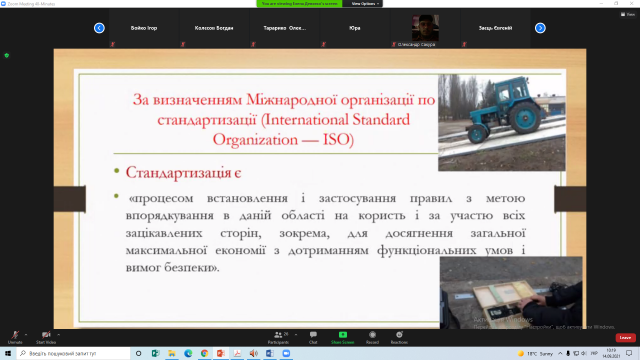 14 вересня 2021 року було проведено доцентом кафедри технічного сервісу та інженерного менеджменту імені М. П. Момотенка Дев’ятко Оленою Сергіївною лекцію на тему «Організаційно-правові основи стандартизації в Україні» з навчальної дисципліни «Стандартизація та сертифікація сільськогосподарської техніки» для ОС «Бакалавр» з спеціальності 208 «Агроінженерія.