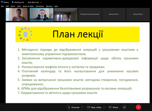Лекція була прочитана для студентів 4 курсу ОС «Бакалавр» спеціальності «Менеджмент» з використанням програмного забезпечення для проведення відеоконференцій Webex.