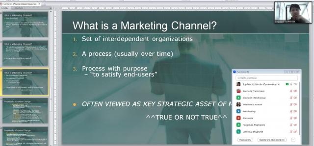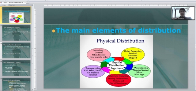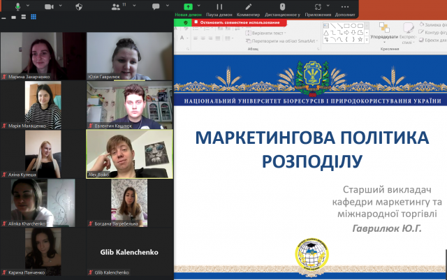 Під час проведення заняття старший викладач кафедри Гаврилюк Юлія Григорівна провела лекцію з дисципліни маркетингова політика розподілу за темою «Сутність і значення маркетингової політики розподілу підприємства» зі студентами 4-го курсу факультету аграрного менеджменту спеціальності 075 «Маркетинг».