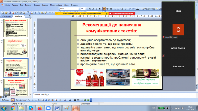 Під час карантину, коли звичний для всіх режим дня і графік навчання порушився, у студентів економічного факультету 3 курсу 5 групи (с.т.н.) для «академічної прокрастинації часу не було». Студенти вивчали економічну, проте зовсім нову для них, динамічну, одночасно креативну і аналітичну, сучасну «філософію підприємницької діяльності» – дисципліну «Маркетинг». Для вивчення теорії та виконання практичних завдань використовували навчальну платформу E-learn. Для спілкування, більш кращого розуміння та освоєння навчального матеріалу проводилися он-лайн зустрічі в сервісі Zoom. Для постійного зв’язку «викладач-студент» використовувалися Viber та E-mail.