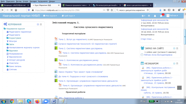 Екзамен з дисципліни «Маркетинг» розпочався в запланований час та у відповідності із затвердженим розкладом проведення заліково-екзаменаційної сесії на економічному факультеті. Дистанційна форма здачі екзамену відбувалася через навчальний портал НУБіП України на платформі Е-learn.