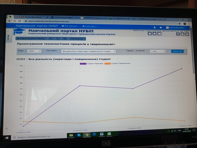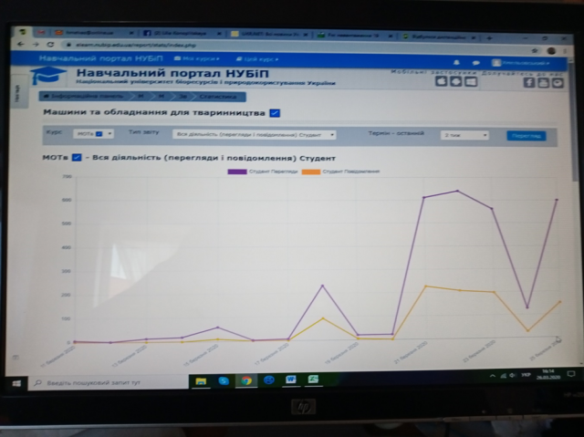 Викладачами кафедри механізації тваринництва було завчасно викладено відеоматеріали за темами лекцій, передано електронні варіанти підручників та посібників. Із отриманим матеріалом студенти повинні будуть ознайомитись самостійно. Для проведення лабораторних робіт студенти використовують робочі зошити. Кожна робота передбачає вивчення будови, принципу роботи та отримання навичок у регулюванні робочих органів машин. Студенти ОС «Магістр» виконують розрахунки та вибирають раціональні варіанти в процесі проектування та управління усіма технологічними процесами. Метою цієї роботи є розробка проекту та обґрунтування комплексу виробничих об’єктів, які будуть відповідати вимогам енергоощадності при виробництві тваринницької продукції. Спілкування студентів із викладачами відбувалось через електронний ресурс на чаті «КАРАНТИН». Студенти прикладають зусилля для вивчення матеріалу, отримують запитання на які повинні дати відповіді. Під час занять згідно розкладу за допомогою викладача студенти могли отримати відповіді на свої запитання. Також, з деякими студентами, відбувалось спілкування за допомогою електронної пошти. Для зручності спілкування на період карантину створено форум на сторінці курсу. Активність користувачів курсами: