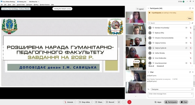 Підсумки першого навчального тижня весняного семестру і пріоритетні напрямки діяльності гуманітарно-педагогічного факультету 11 лютого 2022 року розглянули гуманітарії на розширеній онлайновій адміннараді за головування декана Інни Савицької.