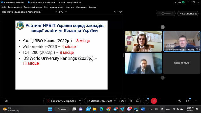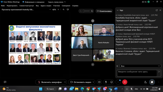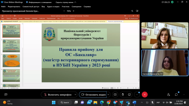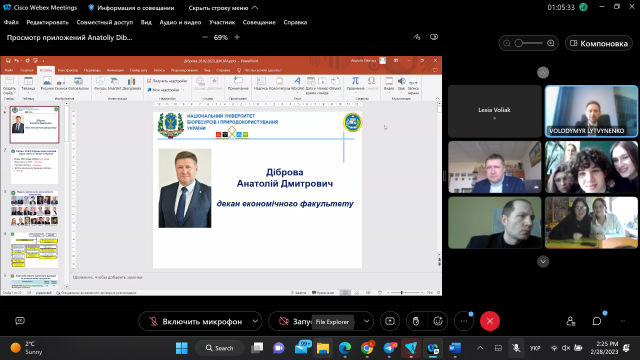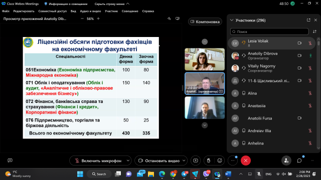 28 лютого 2023 року, в останній день зими, на економічному факультеті Національного університету біоресурсів і природокористування України відбувся онлайн День відкритих дверей для випускників шкіл, технікумів і коледжів.    Економічний факультет гостинно відкрив віртуальні двері для майже 350 майбутніх абітурієнтів та їх батьків, що мали можливість в режимі реального часу поспілкуватися з керівництвом факультету і кафедр, поставити свої запитання. Захід відвідали абітурієнти з опорного закладу «Новооржицька загальноосвітня школа І-ІІІ ступенів Новооржицької селищної ради», ОЗ «Тарандинцівська ЗОШ І-ІІІ ступенів ім. В.А.Симоненка», Лазірківської ЗОШ 1-3 ступенів ім. В.О. Підпалого, Лісниківського ліцею ім. М. Грушевського, Кам’янець-Подільського ліцею № 15, Миронівської ЗОШ № І-ІІІ ступенів, комунального закладу Кагарлицької міської ради «Буртівський ліцей», Бобровицької середньої школи №1, гімназії № 48 м. Києва, спеціалізованої школи № 277 м. Києва, Гатненського ліцею, Тинівського ЗЗСО Черкаської обл., загальноосвітньої школи І-ІІІ ступенів № 151 м. Києва, загальноосвітньої школа І-ІІІ ступенів № 37 м. Києва, Жашківського закладу середньої освіти І-ІІІ ступеня № 3, Березненського економіко-гуманітарний ліцею Рівненської обл., київського професійного ліцею транспорту, вишнівецького ліцею Вишнівецької селищної ради Кременецького району Тернопільської області, Вороньківського ліцею Вороньківської сільської ради Бориспільського району Київської області, Бігунського ліцею Словечанської сільської ради, приватної школи «Європейський колегіум» м. Києва, середньої школи № 69 м. Києва, комунального закладу «Ребедайлівський ліцей Михайлівської сільської ради Черкаського району Черкаської області», середньої загальноосвітньої школи № 221 м. Києва, ліцею №116 м. Києва, середньої загальноосвітньої школи № 160 м. Києва, Броварського ліцею № 6 Броварської міської ради Броварського району Київської області, НВК № 157, середньої школи № 196 м. Києва, гімназії № 275 «Синьоозерна», гімназії «Києво-Могилянський колегіум» ІІ-ІІІ ступенів, ЦТ «Шевченківець», середньої загальноосвітньої школи № 269 м. Києва, державного професійно-технічного навчального закладу «Броварський професійний ліцей», Вінницького ліцею № 7, Гуманітарного ліцею №1 імені М.І.Пирогова, гімназії № 23 м. Києва, Борзнянського ліцею; Таращанського академічного ліцею «Ерудит», ЗОШ І-ІІІ ст. № 30 м. Києва, ЗОШ І-ІІІ ст. № 108 м. Києва, спеціалізованої школи № 113 м. Києва; гімназії 315 м. Києва, спеціалізованої школи №8 м. Хмельницького, Броварського ліцею №7, Новосілківського академічного ліцею «Ерудит», академії мистецтв ім. П. Чубинського, гімназії «Успіх» м. Києва, Можарівського ліцею Словечанської сільської ради Вишнівського академічного ліцею; Вишнівського академічнго ліцею №2, школи №8, м. Києва, КПНЗ «Київська Мала академія наук учнівської молоді Житомирського агротехнічного фахового коледжу, ВСП Шевченківський фаховий коледж Уманського НУС, Першого Київського Медичного коледжу, Ірпінського фахового коледжу, Заліщицького фахового коледжу ім. Є. Храпливого, ВСП Мукачівського фахового коледжу НУБіП, Сосницького сільськогосподарського технікуму бухгалтерського обліку, Борзнянського аграрного фахового коледжу, ВСП Рівненський фаховий коледж НУБіП, Бережанського фахового кол