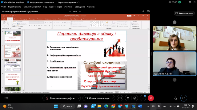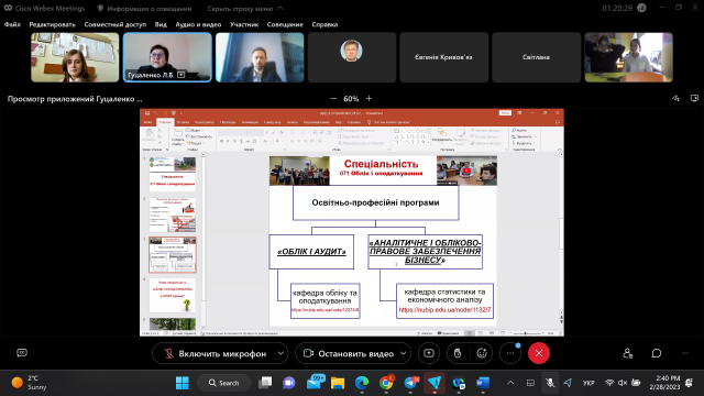 Любов Гуцаленко, д.е.н., професор, завідувач кафедри обліку та оподаткування представила спеціальність 071 «Облік та оподаткування», розкрила переваги навчання, можливості подальшого працевлаштування та розповіла про особливості навчання за освітніми програмами «Облік і аудит» та «Аналітичне і обліково-правове забезпечення бізнесу».     Про переваги навчання за спеціальністю 072 «Фінанси, банківська справа та страхування» розповіла Надія Давиденко, д.е.н., професор, завідувач кафедри фінансів. Особливу увагу Надія Миколаївна приділила перевагам навчання за освітніми програмами «Фінанси і кредит» та «Корпоративні фінанси» для максимальної реалізації потенціалу абітурієнтів та успішного працевлаштування.     Микола Ільчук представив спеціальність 076 «Підприємництво, торгівля та біржова діяльність», окреслив її перспективи в сучасному світі та важливість фахівців даного напряму на ринку праці.