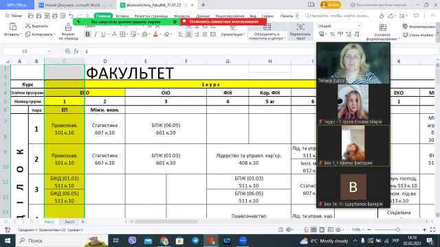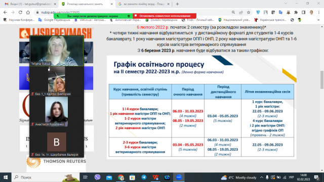 Куратор групи, к.е.н., доцент кафедри економіки Тетяна Гуцул, ознайомила першокурсників з графіком освітнього процесу в II семестрі, який розпочнеться 6 лютого 2023 року за розкладом знаменника. У зв`язку із перебоями у постачанні електроенергії у м. Києві та складною ситуацією з опаленням приміщень університету, перші чотири тижні навчання будуть відбуватися у дистанційному форматі. Наступною темою обговорення стало не менш важливе питання - дотримання дисципліни в навчальному процесі. Студенти ознайомились з розкладом занять та термінами навчальної практики.