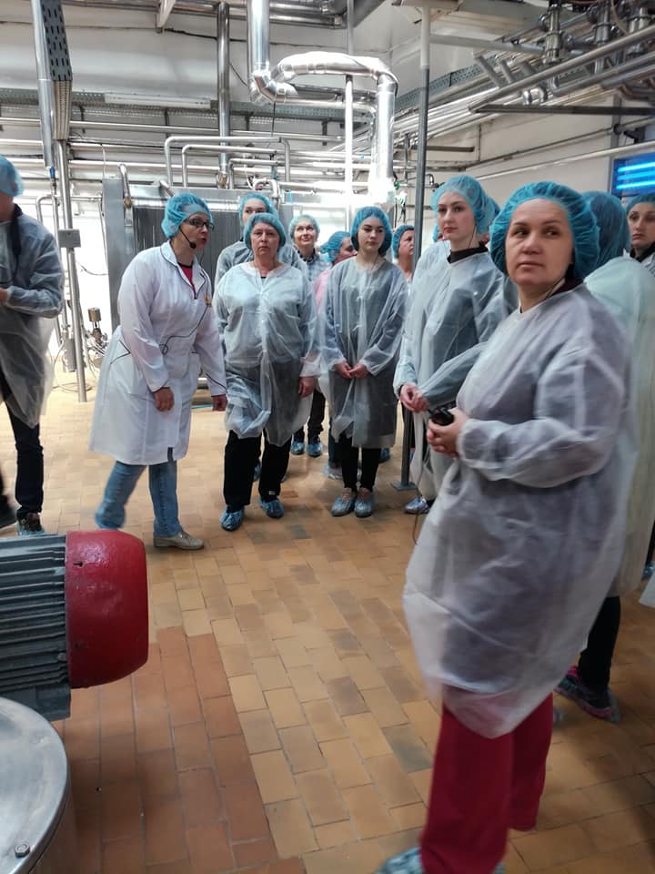 Далі головний технолог підприємства провела екскурсію цехами підприємства, де відвідувачів ознайомили з ключовими виробничими процесами на підприємстві. Студенти відвідали приймально-апаратний цех та виробничі цехи з виробництва сухої молочної продукції, сирцех, маcлоцех; на власні очі побачили як відбуваються процеси соління та пакування сиру, як виглядає камера дозрівання сирів; поспостерігали за процесами пакування масла та сухої сироватки тощо.