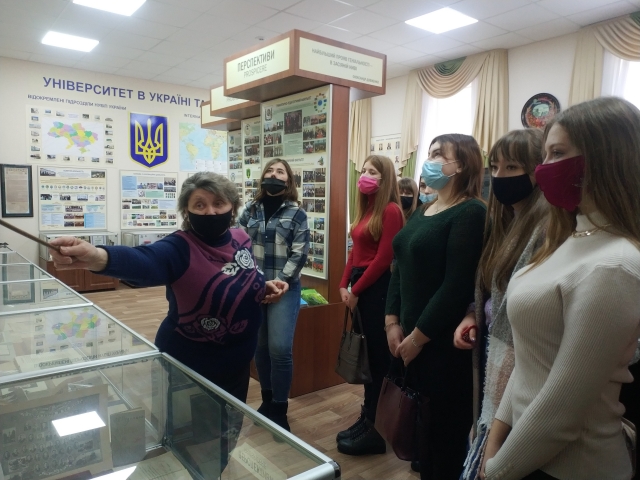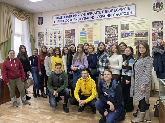 Студентам провела екскурсію співробітник музею Тетяна Миколаївна Чумак, яка розповіла про історію становлення та розвитку нашого університету. У музеї студенти змогли побачити становлення сільського господарства на території України та історію становлення майбутнього передового аграрного університету, участь співробітників університету у Другій світовій війні та АТО, період відновлення Голосіївських інститутів, утворення УСГА, підписання перших міжнародних угод, культурно-масове життя студентів та сучасну діяльності ННІ та факультетів НУБіП України.