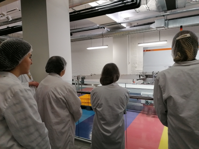 Виробничі об'єкти кондитерської корпорації ROSHEN сертифіковані відповідно до вимог міжнародних стандартів якості та безпеки продуктів харчування. Усі кондитерські фабрики корпорації ROSHEN забезпечені обладнанням для моніторингу контролю якості продукції та відповідних досліджень. Виробництво орієнтоване на виготовлення тортів, тістечок, кексів, мармеладу, пастили, зефіру, печива та крекерів, а також коробкових цукерок «Київ Вечірній». Лінійка тортів, що випускаються фабрикою, – це не тільки добре відомі й улюблені всіма «Київський» і «Празький», а й новинки виробництва. Студенти мали змогу побачити виробничу лінію, на якій саме відбувалося виробництво маленьких плиточок-цукерок з чорного шоколаду. Лінія є повністю автоматизованою, від заливання шоколаду у форми до пакування готової продукції.