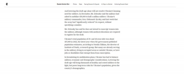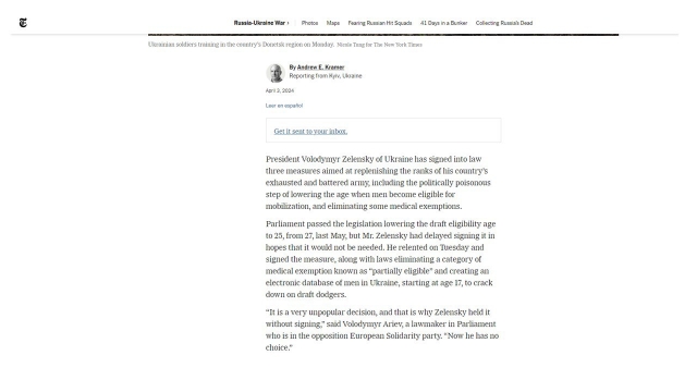 Маємо змогу ознайомитися зі статтею у надпрестижному виданні “The New York Times”«Zelensky Lowers Ukraine’s Draft Age, Risking Political Backlash»: https://www.nytimes.com/2024/04/03/world/europe/zelensky-ukraine-military-draft-age.html (“Зеленський знижує призовний вік в Україні, ризикуючи політичною реакцією”) Так, Українська армія чисельністю близько одного мільйона військовослужбовців веде найбільшу війну в Європі з часів Другої світової війни, яка відбувається в окопах та на руїнах міст. Рівень жертв надвисокий. Більшість чоловіків, які мали запит реалізувати бажання захищати піти в армію, вже зробили це.