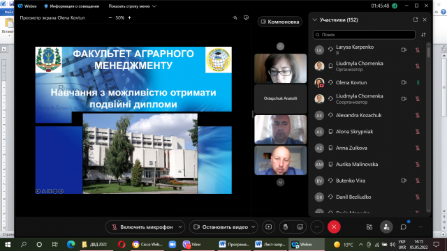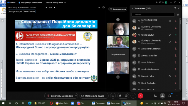 Заступник декана з міжнародної діяльності, доцент Олена Ковтун більш детально зупинилася на можливостях навчання закордоном, детально розповіла про навчання в університетах-партнерах Словаччини, Німеччини, Англії, Японії, Польщі, які дають можливість отримати диплом НУБіП України та європейського зразка.