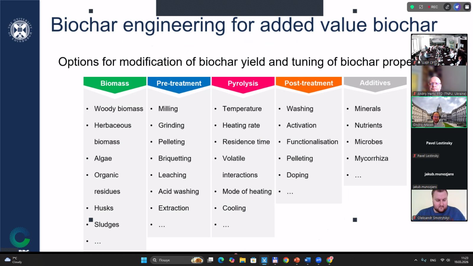 Зокрема, професор Ондржей МАСИК (Единбурзький університет, Велика Британія) та доктор Павел ЛЕШТИНСЬКИЙ (Технічний університет Острави, Чехія) представили експертні доповіді щодо виробництва біочару та його застосування. Українські дослідники — доценти Андрій ГЕРЦ і Олександр КОНОНЧУК (Тернопільський національний педагогічний університет імені Володимира Гнатюка) — представили результати досліджень щодо впливу біочару на рослини в умовах модельного експерименту. Артем МЕДКОВ представив результати досліджень отримання біочару з некондиційної біомаси міскантусу.