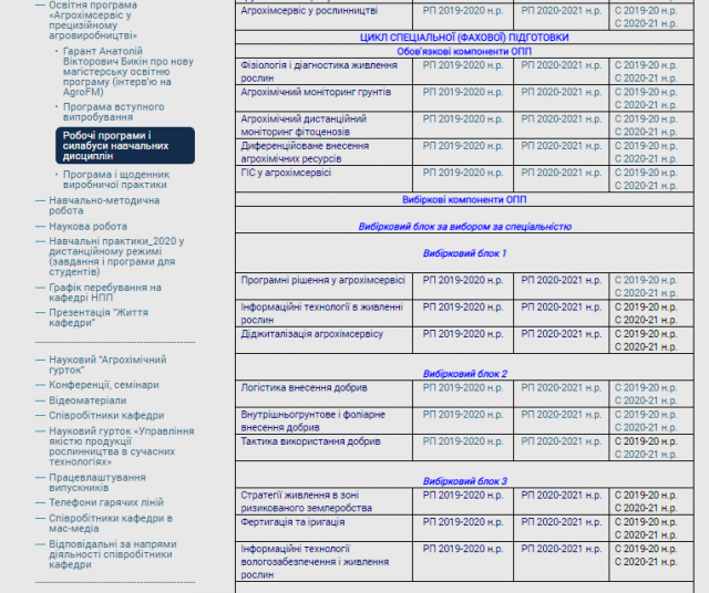 З переліком дисциплін вільного вибору за спеціальністю (освітньою програмою), їх робочими програми і силабусами за освітньою програмою студенти можуть ознайомитись на електронній сторінці кафедри (випускова кафедра) у розділі «Освітня програма «Агрохімсервіс у прецизійному агровиробництві»», закладка «Робочі програми і силабуси навчальних дисциплін» (https://nubip.edu.ua/node/1233/11).