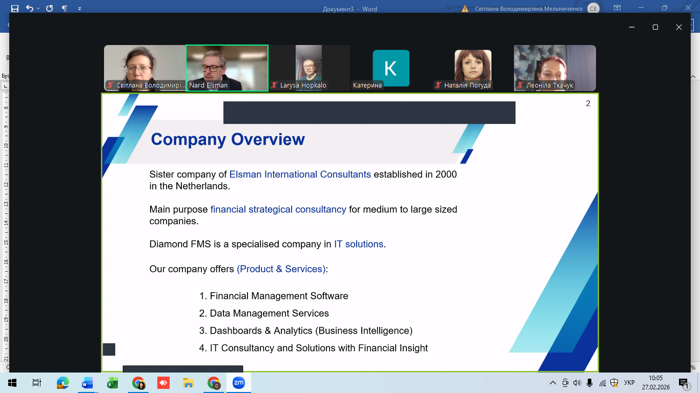27 лютого 2026 року відбулася онлайн-зустріч здобувачів вищої освіти спеціальностей «Готельно-ресторанна справа та кейтеринг», «Туризм та рекреація» і викладачів кафедри готельно-ресторанної справи та туризму економічного факультету НУБіП України із представниками нідерландської компанії-розробника програмного забезпечення Diamond FMS.