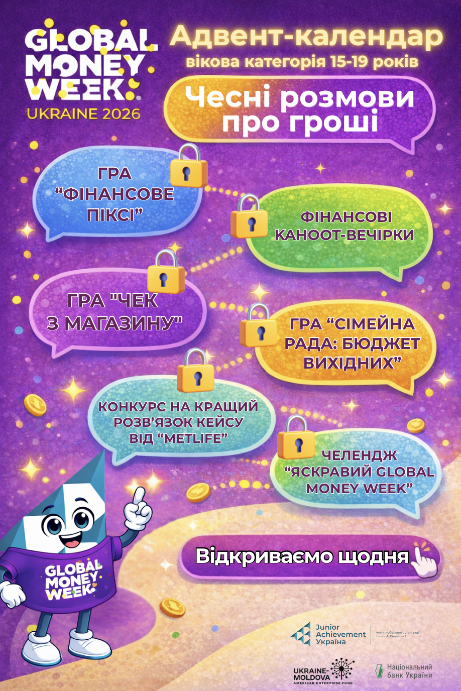 Global Money Week — це міжнародна інформаційна кампанія з фінансової обізнаності, спрямована на поглиблення знань дітей і молоді щодо управління фінансами та формування відповідального фінансового мислення. Ініціатива, започаткована у 2012 році, щороку об’єднує все більше країн світу, утверджуючи фінансову грамотність як ключову компетентність сучасності. У 2026 році заходи Global Money Week традиційно об’єднали учасників в Україні та світі під гаслом «Smart Money Talks» («Чесні розмови про гроші»). Вона акцентує увагу на важливості відкритого, усвідомленого діалогу про фінанси в родині, школі та суспільстві. Йдеться не лише про знання, а про формування культури фінансових рішень.