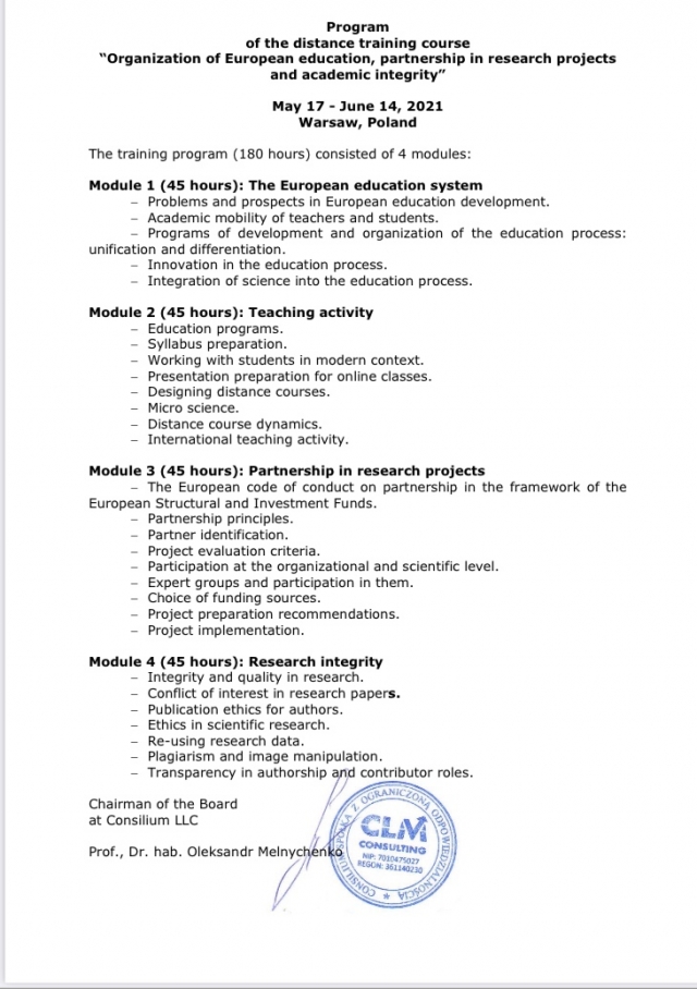З 17 травня по 14 червня 2021 року аспірантка першого року навчання освітньої програми 011 Освітні педагогічні науки Медяник Ганна Андріївна взяла участь у онлайн-стажуванні для освітян “Організація європейської освіти, партнерство в наукових проектах та академічна доброчесність”. Програма реалізувалась науковою організацією CONSILIUM SPÓŁKA Z OGRANICZONĄ ODPOWIEDZIALNOŚCIĄ (м. Варшава, Польща).