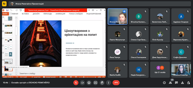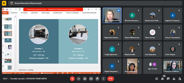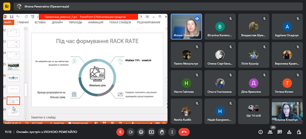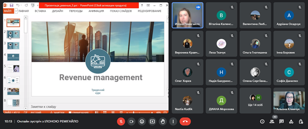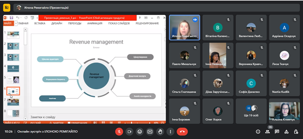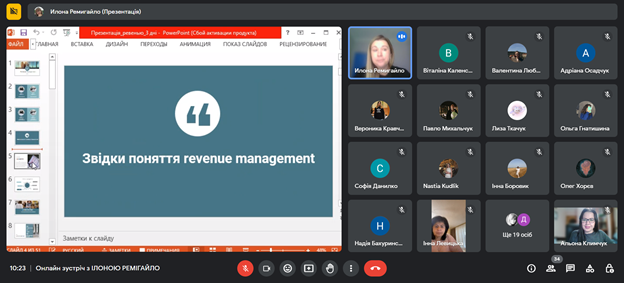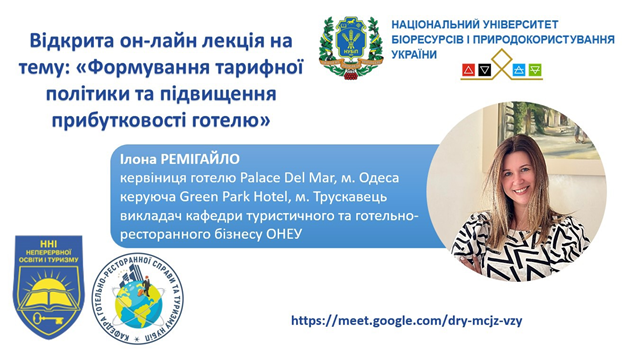 Лекція Ілони РЕМІГАЙЛО на тему «Формування тарифної політики та підвищення прибутковості готелю» була присвячена особливостям revenue management, а саме як обрати цільову аудиторію, бюджет, проводити аналітику в умовах діджиталізації, формувати ціну на готельну послугу та аналізувати конкурентів, а найголовніше, як приймати ефективні рішення у несталі часи.