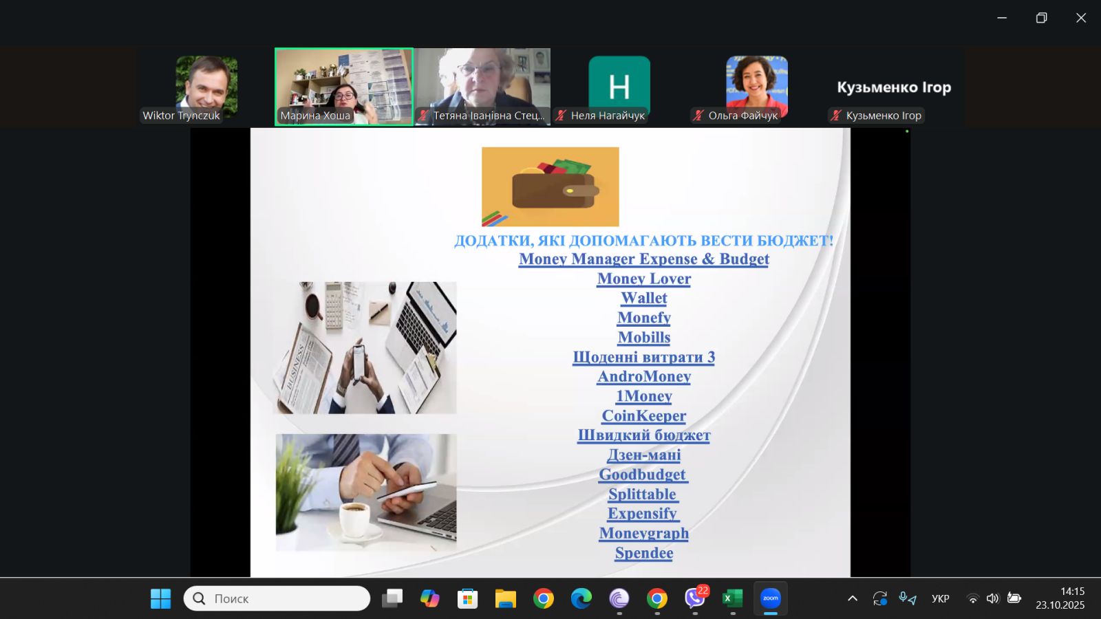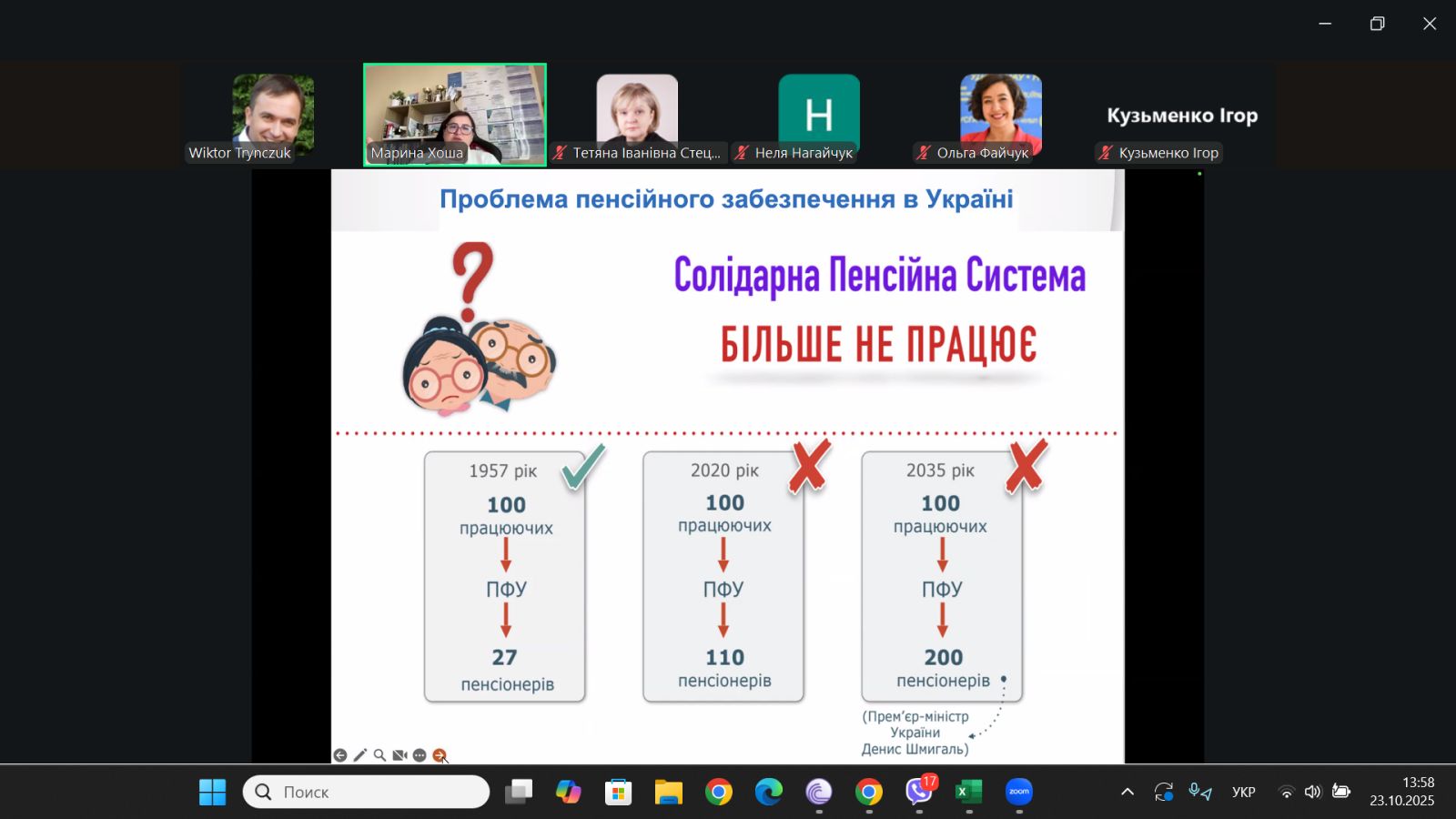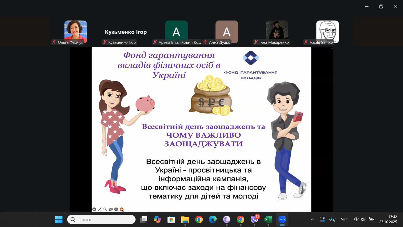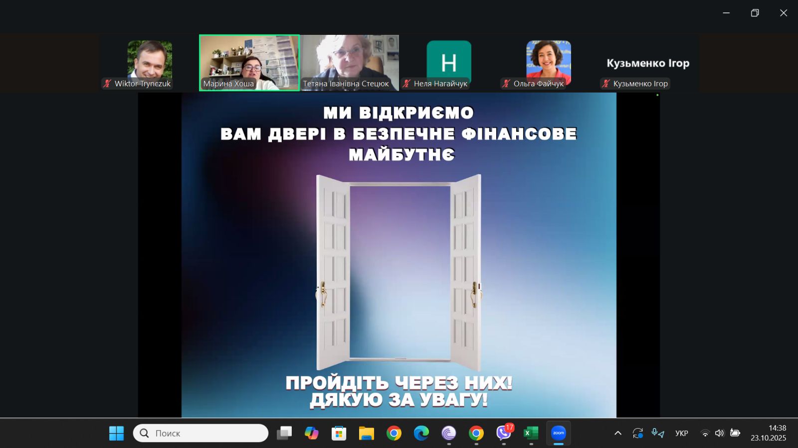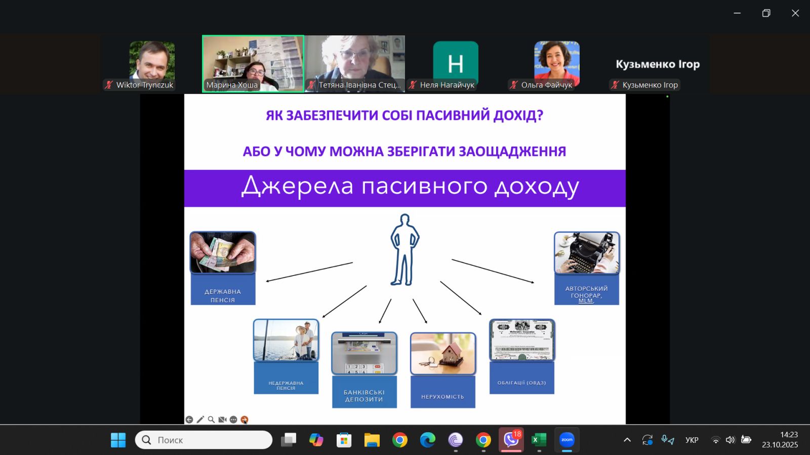23 жовтня 2025 року викладачі кафедри банківської справи та страхування НУБіП України разом зі здобувачами освіти спеціальності D2 "Фінанси, банківська справа, страхування та фондовий ринок", членами наукового студентського гуртка "Банки, фінансові ринки та агробізнес: виклики сьогодення" в рамках Академії фінансової грамотності FinHub_4.0" долучилися до гостьової лекції Марини ХОШІ на тему: «Операції недержавних пенсійних фондів», яка відбулася на платформі ZOOM за ініціативи кафедри банківської справи та страхування КНЕУ імені Вадима Гетьмана. Захід було приурочено до Всесвітнього дня заощаджень, який щорічно відзначається наприкінці жовтня.