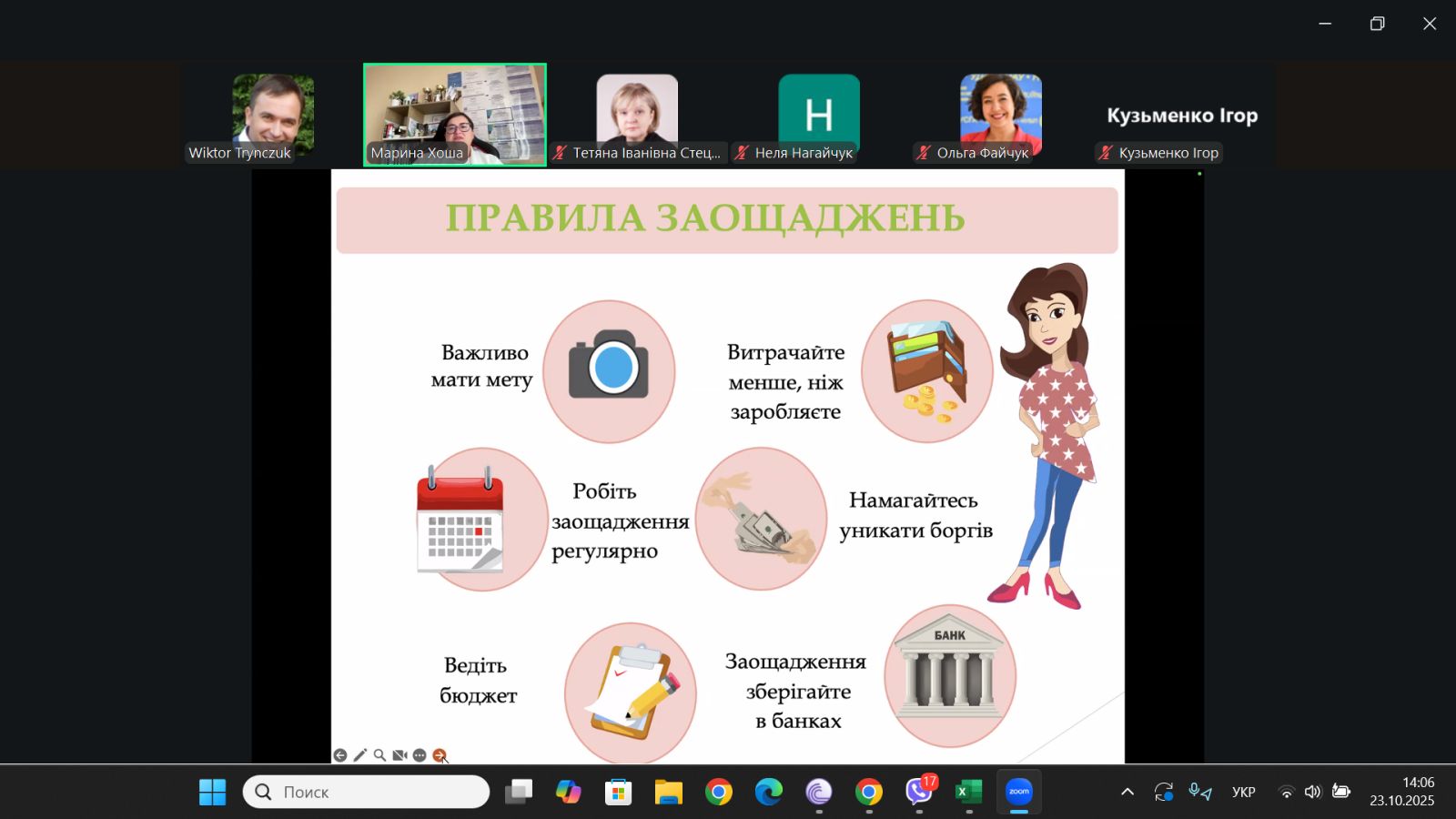 Лекція пройшла у динамічному форматі: інтерактивні запитання, яскраві ілюстрації, практичні кейси та добірка інструментів для щоденного контролю витрат. Наприкінці зустрічі пані Марина наголосила: «Ми відкриваємо двері у безпечне фінансове майбутнє — пройдіть через них!»