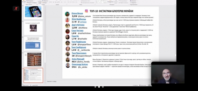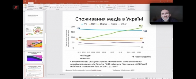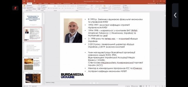 Андрій Вдовиченко розказав студентам свій життєвий шлях від студента факультету економіки та управління КНЕУ до генерального директора компанії Бурда Медіа. Презентація була досить цікавою, спікер зупинився на таких цікавих моментах, як споживання медіа в Україні, представив на сьогоднішній день топ-10 інстаграм-блогерів України, розповів про сучасну друкарську машинку і її особливості, обсяг інвестицій, який направляється в рекламу та «Гарлемський вісник» - одну із найстаріших газет у світі.