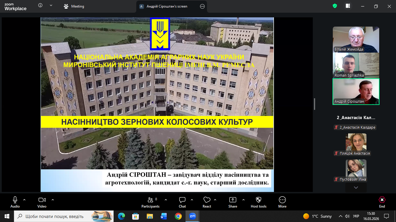 Роботу розпочав Андрій СІРОШТАН, кандидат с.-г. наук, старший дослідник, завідувач відділу насінництва та агротехнологій Миронівського інституту пшениці імені В.М. Ремесла із темою: "Насінництво зернових культур".